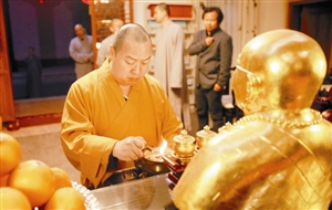 方外之人印顺大和尚,仿佛一架无法停息的时钟。1月20日记者下午3点到弘法寺采访他时,他正在经堂向数百信徒说法;5点,他接待寺外来的一批僧人;6点,又有外出接待活动。身边工作人员告诉记者,大和尚从清早起床到现在,几无一刻停息,采访只能放在隔天早餐时间。