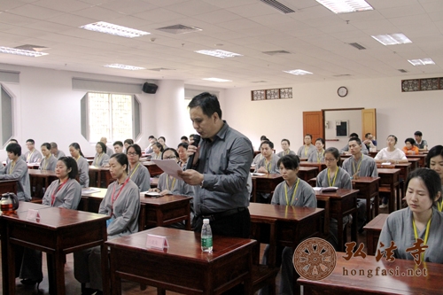 2014年4月18日上午8点,弘法寺佛学院在学院第四课室举行了第七期居士初级培训班开学典礼。中国佛教协会副会长、海南省佛教协会会长、深圳弘法寺方丈印顺大和尚参加了此次开学典礼并作了开示。