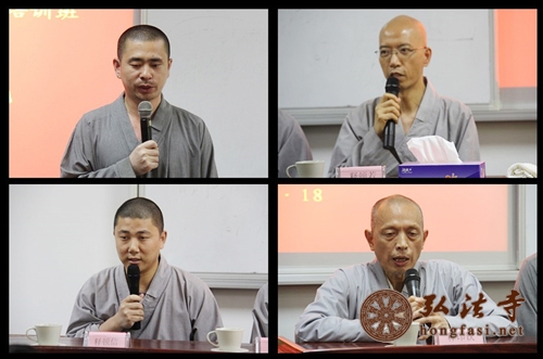 学员们认真聆听及记笔记,开学典礼上充满了浓郁的学习氛围。居士代表上台发言分享学佛心得体会,他说出了在学习过程中遇到种种的困难,并非常感恩弘法寺佛学院能为居士提供这么好的学习机会。他说,“在末法时代能够有机会听闻正法非常不易,我们这个学习班学员年龄差距很大,不管是年轻人还是老年人,能够有时间专门来参加21天的培训是非常难能可贵的,希望我们大家都能珍惜福报,学有所得。”随后,四位指导法师亦发别发言。