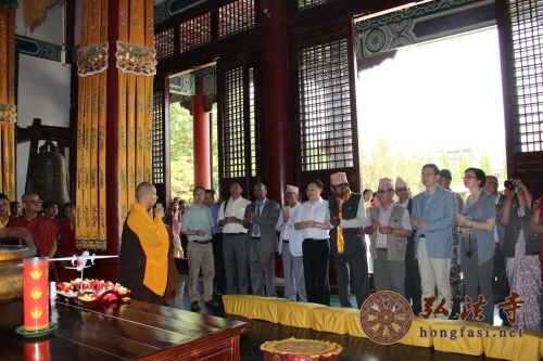 中国佛教协会副会长、南海佛教协会会长、深圳弘法寺及中华寺方丈印顺大和尚委托尼泊尔中华寺当家中勇法师主持本次飞机祈福法会。法会由中勇法师引领中尼领导次第拈香祈福,蓝毗尼内十几个不同国家寺院的僧侣在中华寺大雄宝殿诵经祈福。香云袅袅,梵乐悠扬,缕缕香云掀开中尼和谐邦交的新篇章,声声佛号汇集中尼两国领导人的一个共同心愿:中尼友谊长存。祈福法会在如法如仪中圆满结束。其后,尼泊尔中华寺当家中勇法师受印顺大和尚的委托陪同一行领导参观寺院,并详细介绍了中华寺弘法工作情况。