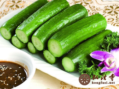 黄瓜500克,精盐、白糖、白醋各适量。先将黄瓜去籽洗净,切成薄片,精盐腌渍30分钟;用冷开水洗去黄瓜的部分咸味,水控干后,加精盐、糖、醋腌1小时即成。此菜肴酸甜可口,具有清热开胃,生津止渴的功效,适用于烦渴,口腻,脘痞等病症,暑天食之尤佳。