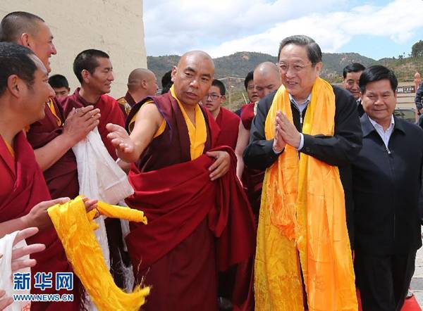 5月16日至17日,中共中央政治局常委、全国政协主席俞正声在云南迪庆藏族自治州调研。这是5月16日,俞正声在松赞林寺看望宗教界人士。新华社记者 刘卫兵 摄