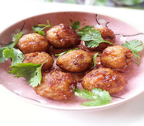 6.放点油在炒锅里,放入丸子翻炒,再下酱油、醋、糖炒匀上碟