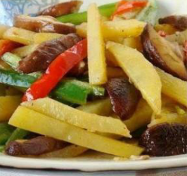 2、起锅热少许油,将土豆条煎至七、八成熟,加入香菇翻炒,同时淋少许酱油和水,快熟时放入青红椒丝,并用盐、香菇精调味即可