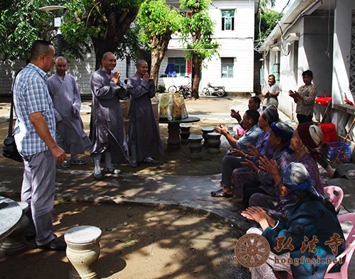弘法网三亚讯:2016年9月13日上午,为贯彻“以道风建设为中心,以慈善事业和佛教文化为两翼,在三亚南山寺创办南海佛学院让中国大乘文化走向世界,开展面向世界的南海战略”发展方向,虔心致力构建“人文佛教”之理念,受中国佛教协会副会长、海南省佛教协会会长、深圳弘法寺方丈、三亚南山寺方丈印顺大和尚委托,南山寺监院顿如法师、监院日定法师、知客顿真法师等组成慰问团,携带月饼、大米、食用油等生活所需物资,慰问了三亚市社会福利院及三亚市天涯区高峰敬老院,向老人和孩子们送上应节礼品和节日诚挚祝福。